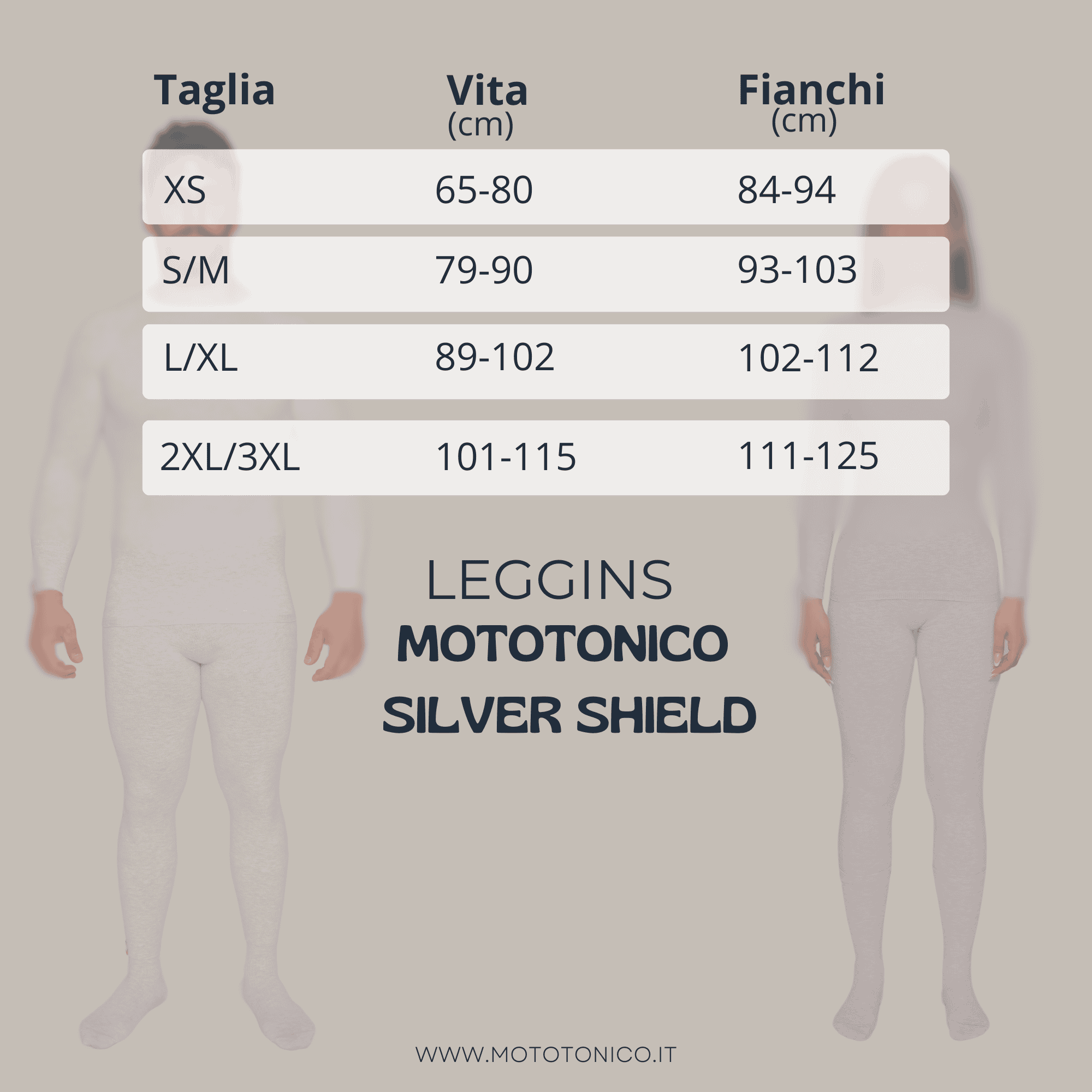 Il leggings tecnico Mototonico Silver Shield è progettato per seguire le linee del corpo, offrendo sostegno muscolare, comfort prolungato e libertà di movimento durante ogni attività.